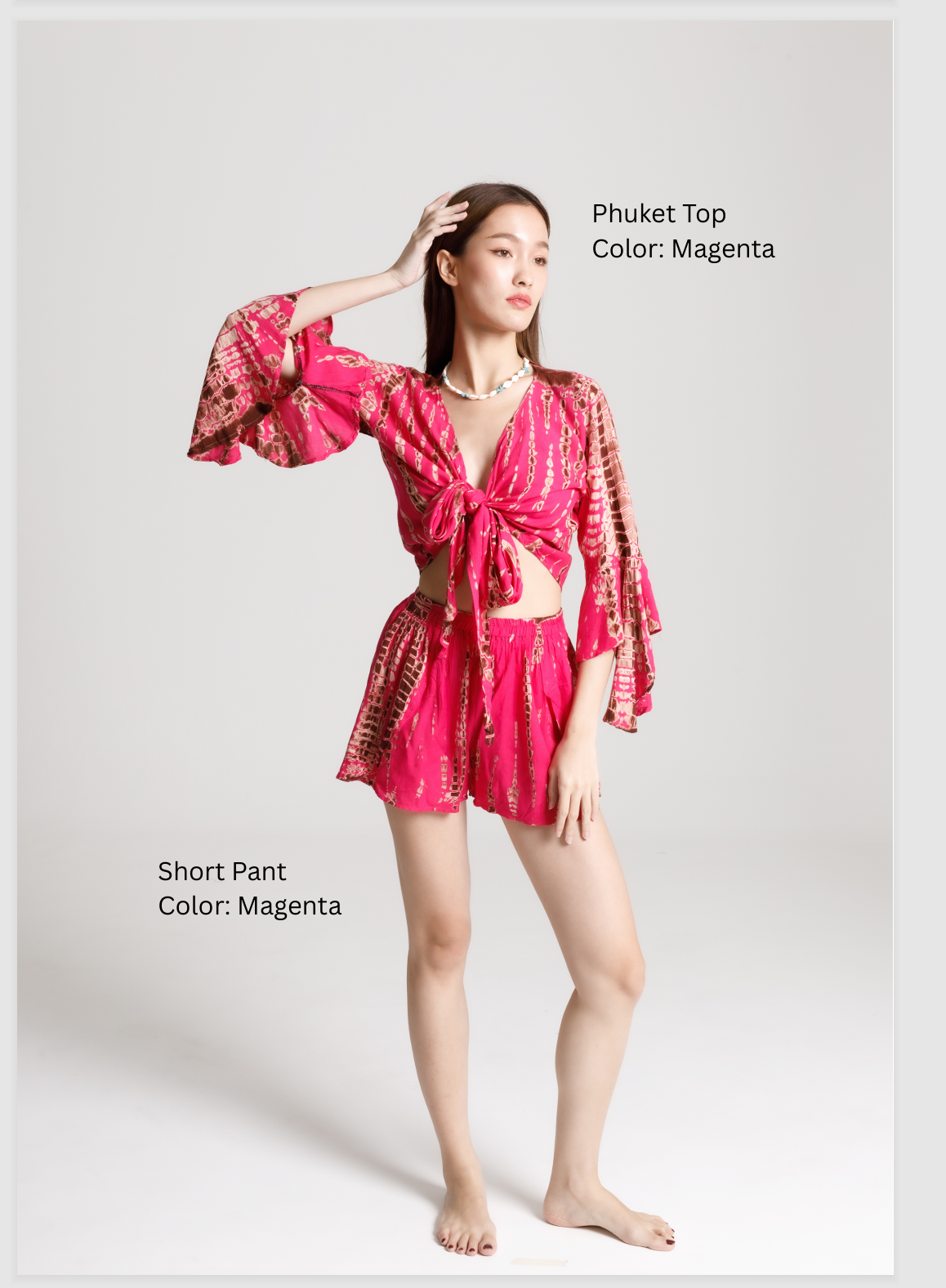 טופ קשירה עם שרוולים רחבים ושורט תואם בגזרה גבוהה – נוח, קליל ומלא סטייל.