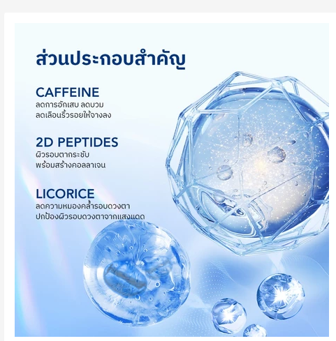 הפורמולה משלבת קפאין, פפטידים פעילים ותמצית ליקוריץ, לפעולה משולבת של מיצוק, הבהרה והחייאת העור סביב העיניים.