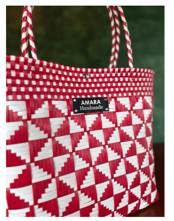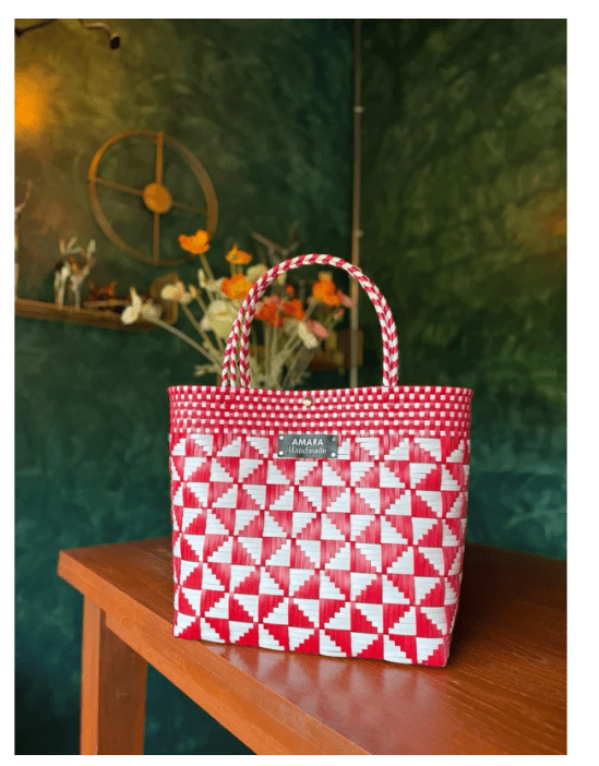 תיק בעבודת יד בעיצוב גאומטרי בהשראת תבנית "גלגל רוח" מסורתית, בצבע אדום דובדבן ולבן למראה קלאסי ונקי.