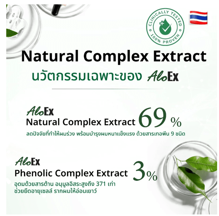 • AloEx Hydrosol Complex (69%) – תמצית מצמחים תאילנדים עשירה בתרכובות טבעיות מסוג Terpene, שמאזנות את הקרקפת, מזינות את שורשי השיער ומונעות נשירה.