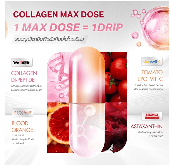 הפורמולה הייחודית כוללת רכיבים פעילים כגון קולגן ימי, ויטמין C, ליפוזום אסטרקסנטין ותמציות טבעיות של רימון וענבים, המסייעים להזנת העור מבפנים, טשטוש כתמים, הפחתת כהויות ושמירה על לחות ורכות טבעית.